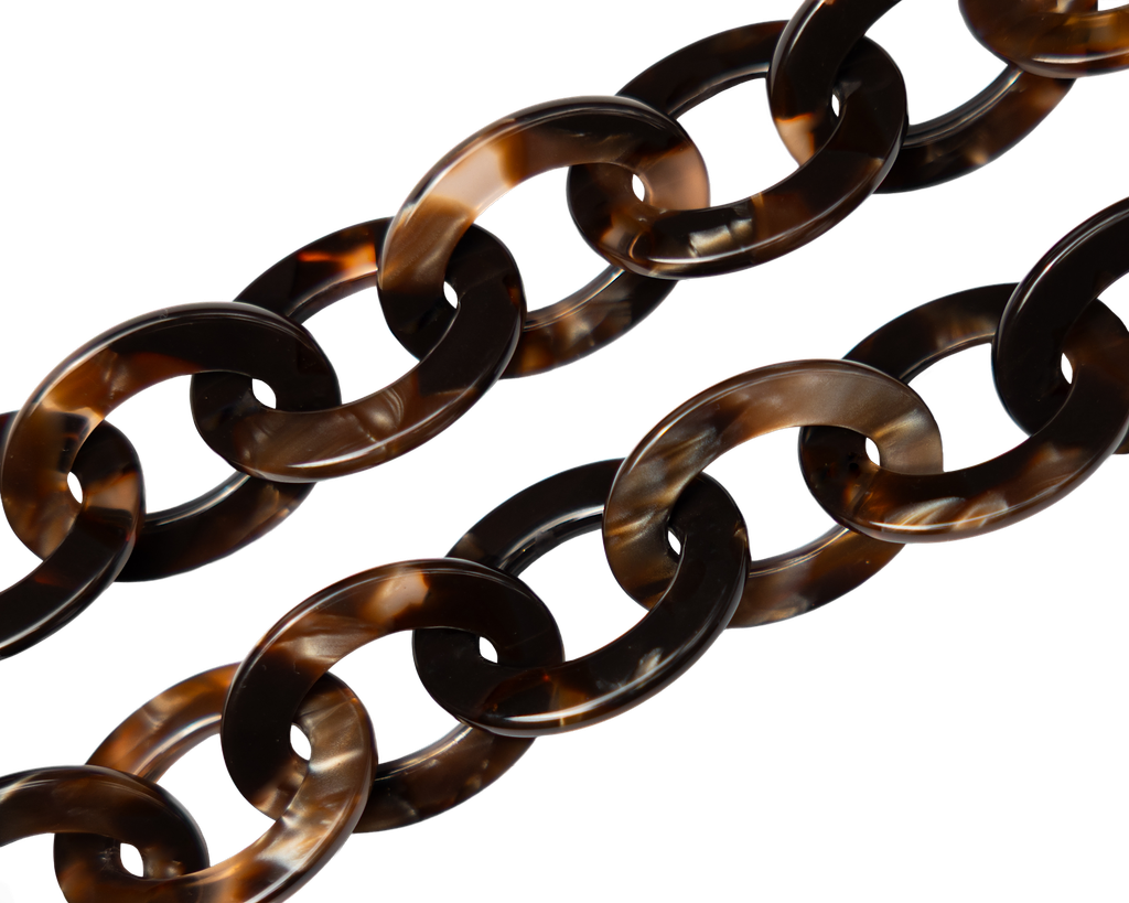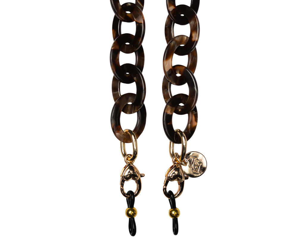 Are you familiar with our frame chains? They are now available in our own acetate colors as well. So, they fit with colors from our glasses! The acetate gives the chains a rich and luxurious appearance. And the wearing comfort of the light acetate is amazing. The Acetate Chains always come with a metal ring which you can attach to the lobster claws. You can easily hang your glasses through the metal ring, or you can attach the silicone loops to your glasses. Two in one!