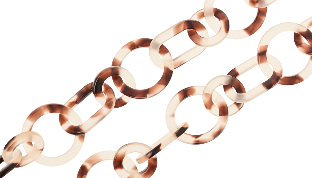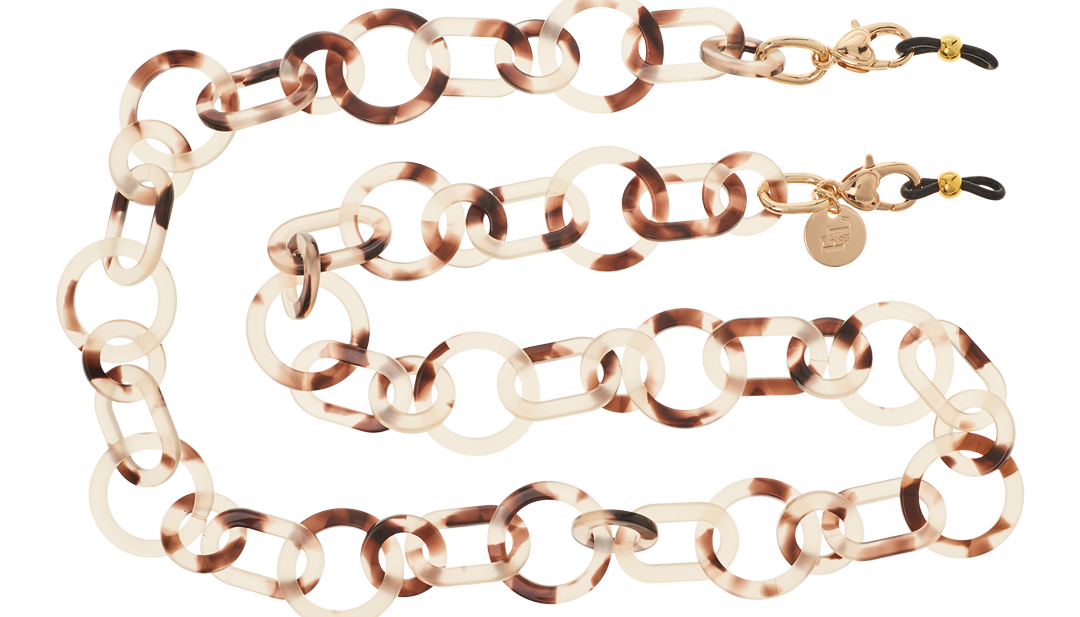 Are you familiar with our frame chains? They are now available in our own acetate colors as well. So, they fit with colors from our glasses! The acetate gives the chains a rich and luxurious appearance. And the wearing comfort of the light acetate is amazing. The Acetate Chains always come with a metal ring which you can attach to the lobster claws. You can easily hang your glasses through the metal ring, or you can attach the silicone loops to your glasses. Two in one!