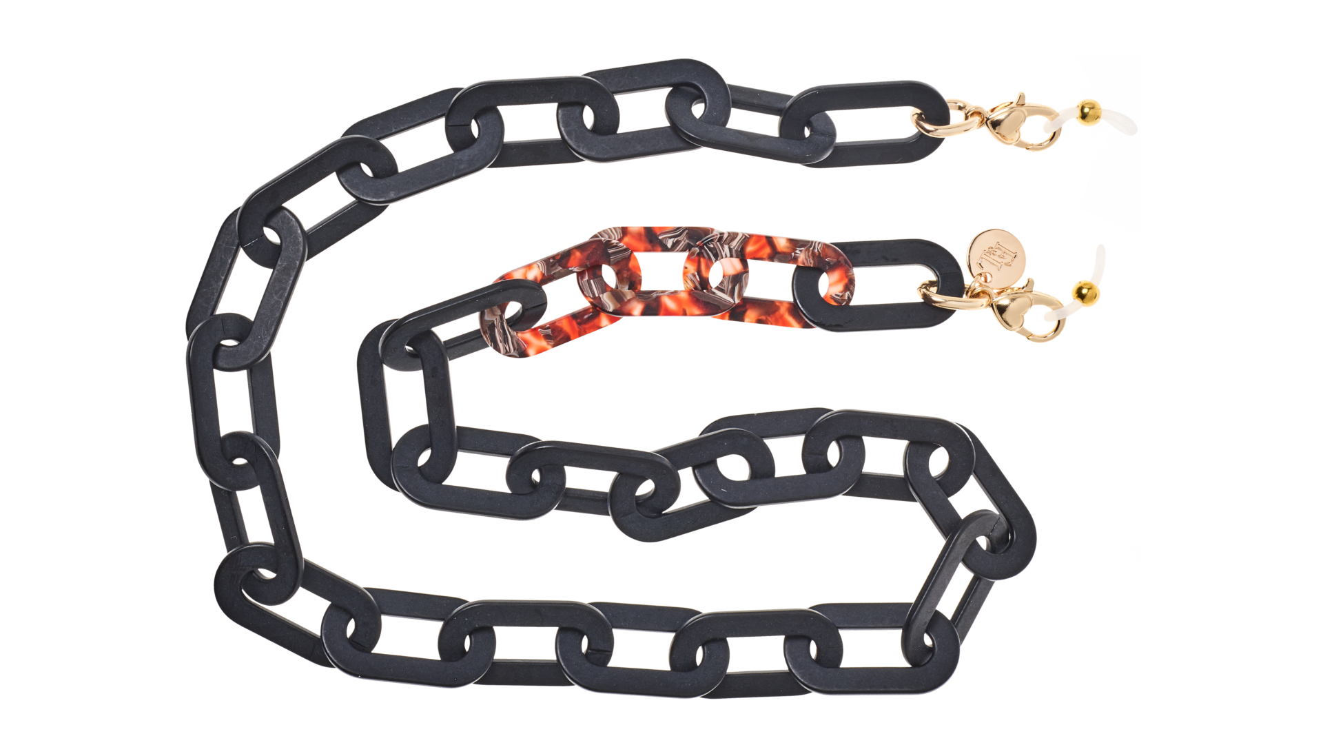Are you familiar with our frame chains? They are now available in our own acetate colors as well. So, they fit with colors from our glasses! The acetate gives the chains a rich and luxurious appearance. And the wearing comfort of the light acetate is amazing. The Acetate Chains always come with a metal ring which you can attach to the lobster claws. You can easily hang your glasses through the metal ring, or you can attach the silicone loops to your glasses. Two in one!