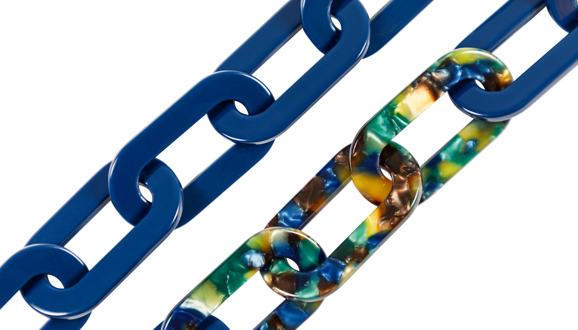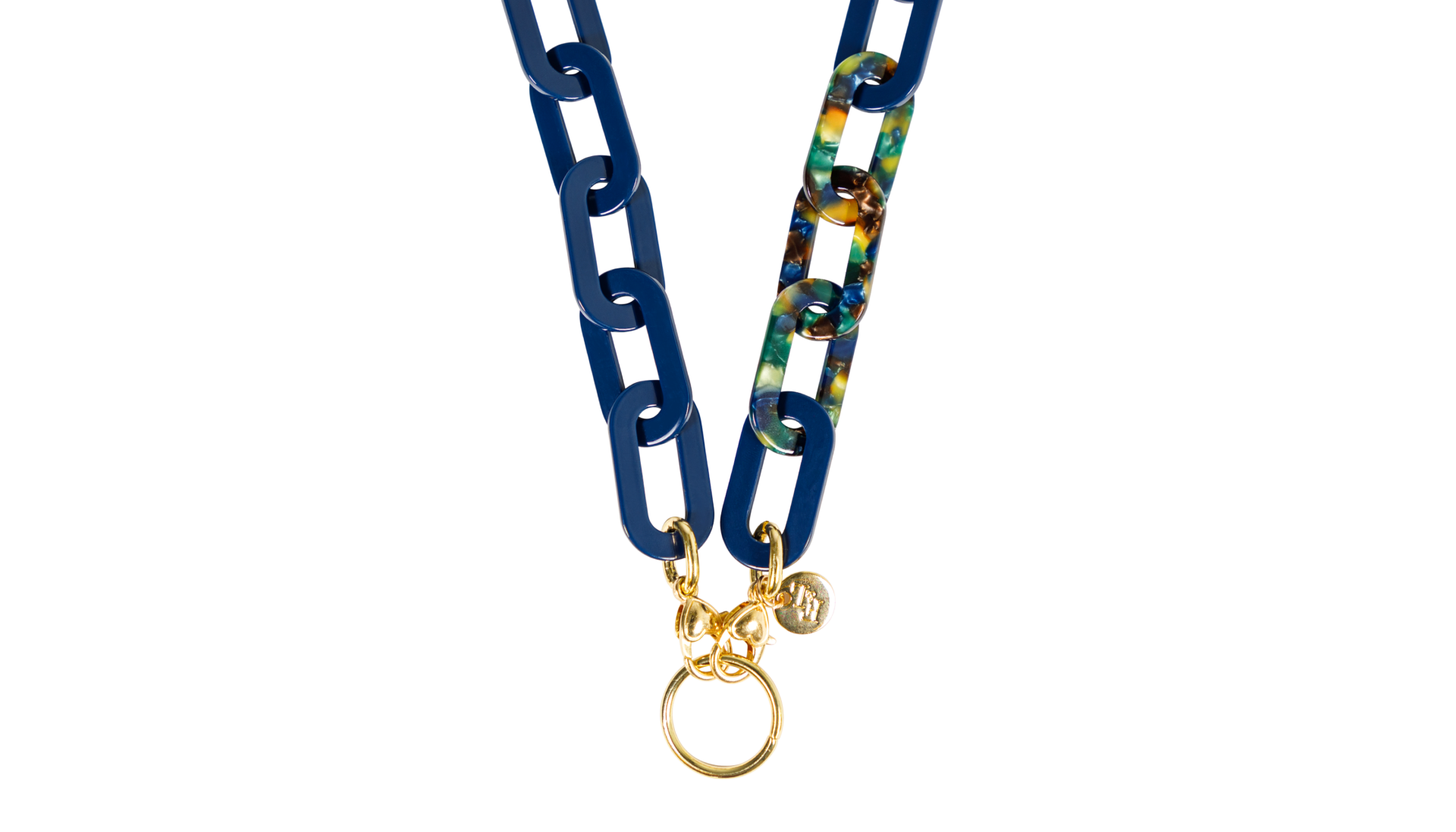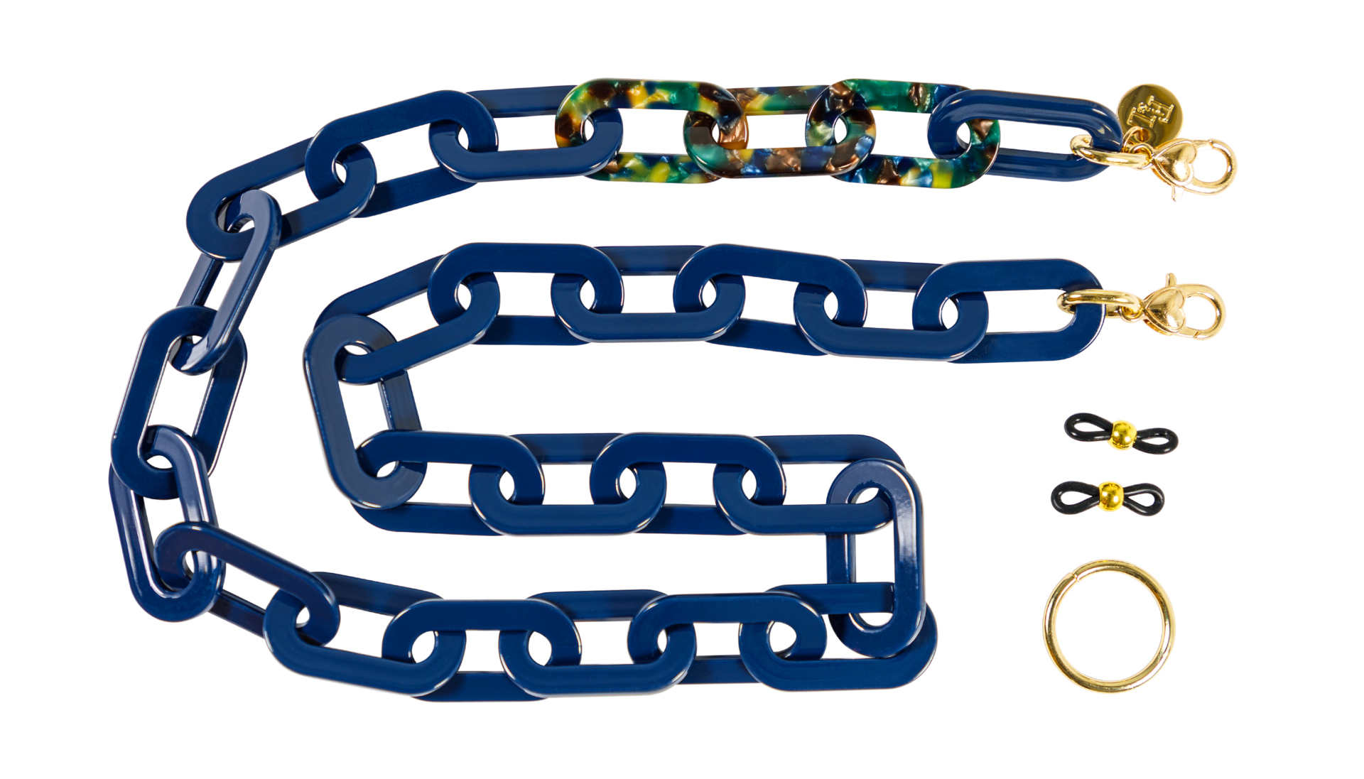 Are you familiar with our frame chains? They are now available in our own acetate colors as well. So, they fit with colors from our glasses! The acetate gives the chains a rich and luxurious appearance. And the wearing comfort of the light acetate is amazing. The Acetate Chains always come with a metal ring which you can attach to the lobster claws. You can easily hang your glasses through the metal ring, or you can attach the silicone loops to your glasses. Two in one!