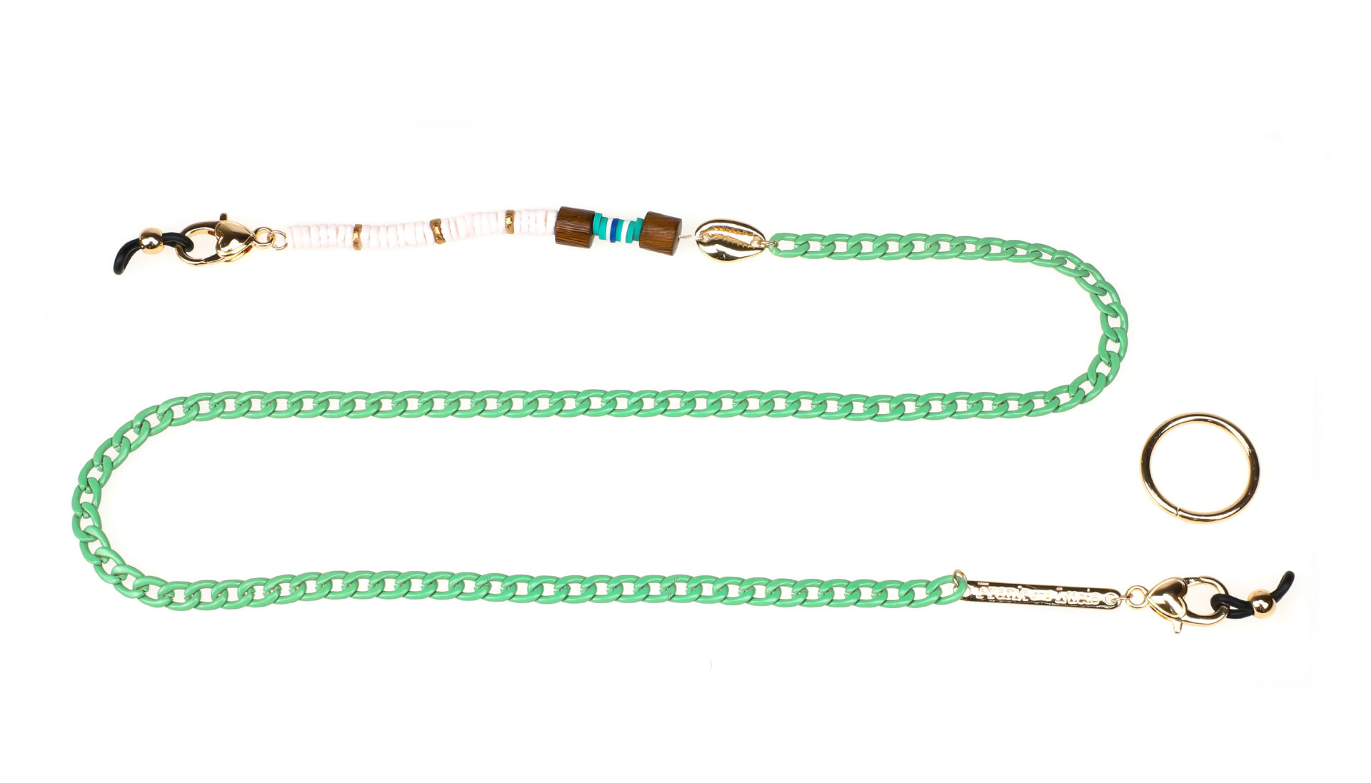 Unique metal frame chain in green with wooden and shell elements. Very light weighted and easy to transform into a necklace with an associated ring where you can hang a pair of glasses in. Beautiful and functional in one.Specifications