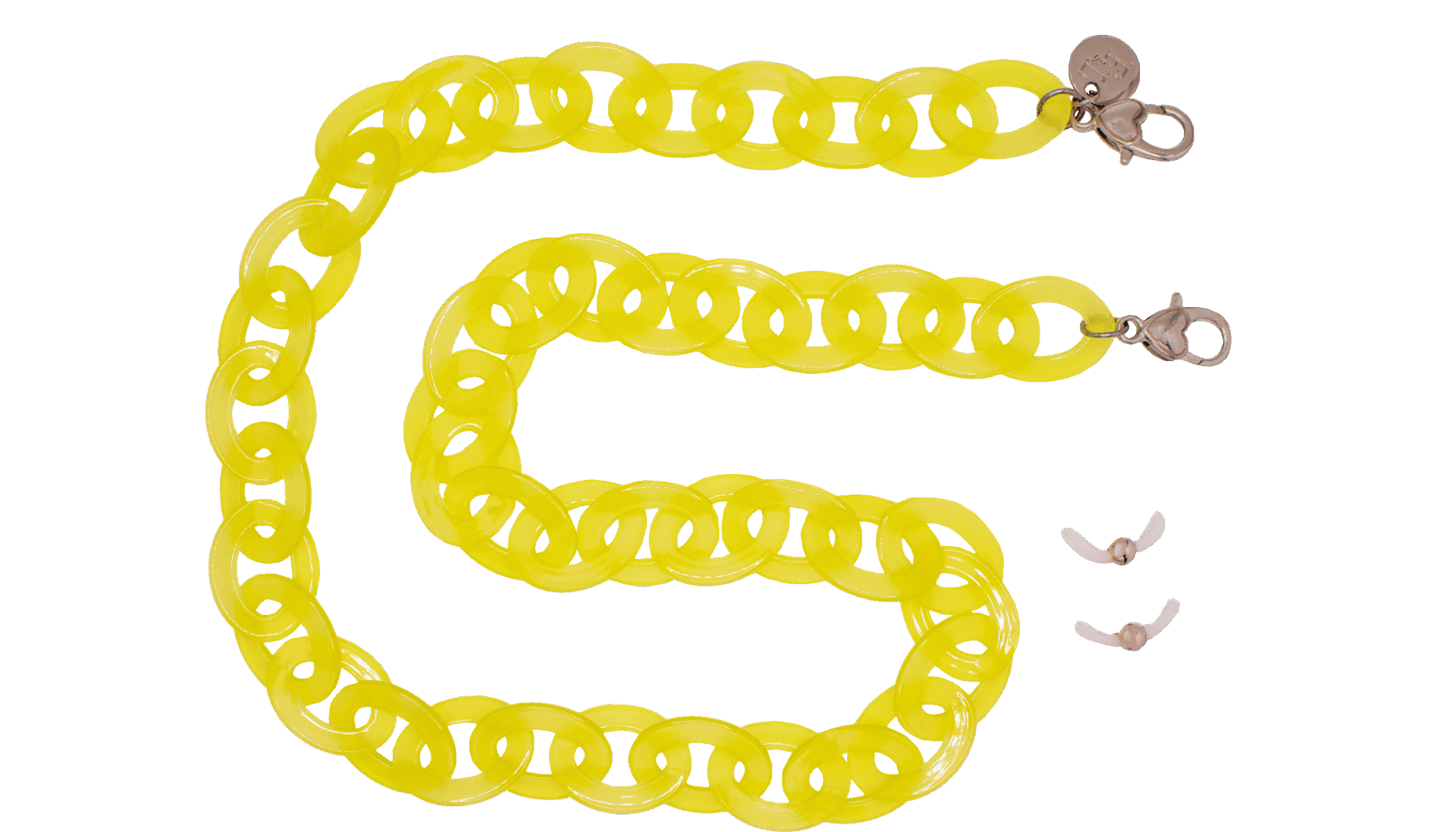Are you familiar with our frame chains? They are now available in our own acetate colors as well. So, they fit with colors from our glasses! The acetate gives the chains a rich and luxurious appearance. And the wearing comfort of the light acetate is amazing. The Acetate Chains always come with a metal ring which you can attach to the lobster claws. You can easily hang your glasses through the metal ring, or you can attach the silicone loops to your glasses. Two in one!