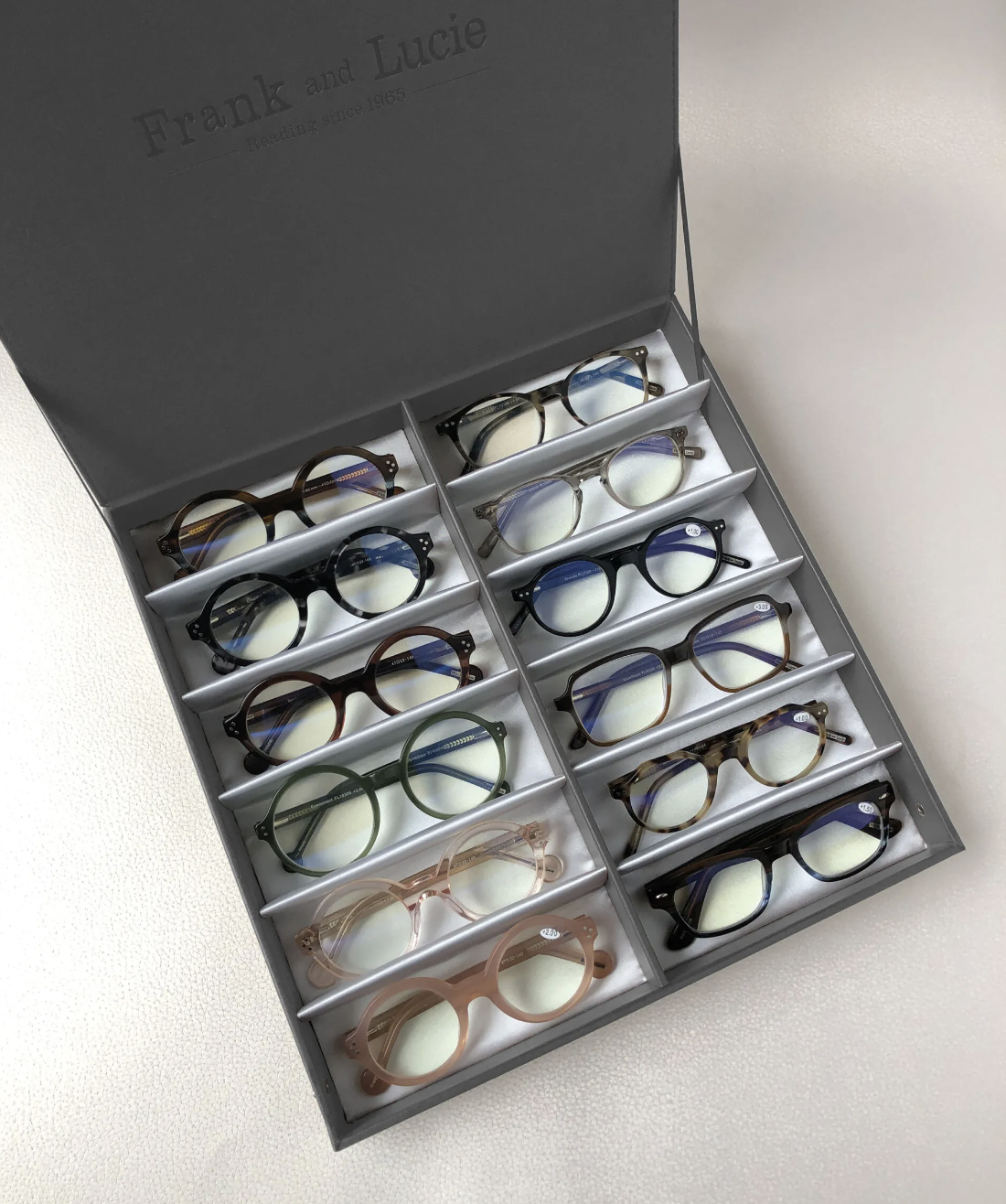 Lucie wants to give you, and your visitors, the full ‘unboxing’ experience. That is why she designed beautiful leatherlook boxes. The boxes have room for 12 glasses and feel luxurious due to the high-quality material. Even though it has a lot of space it easily fits on your counter. We have more colors available, check out the color swatches to see.
