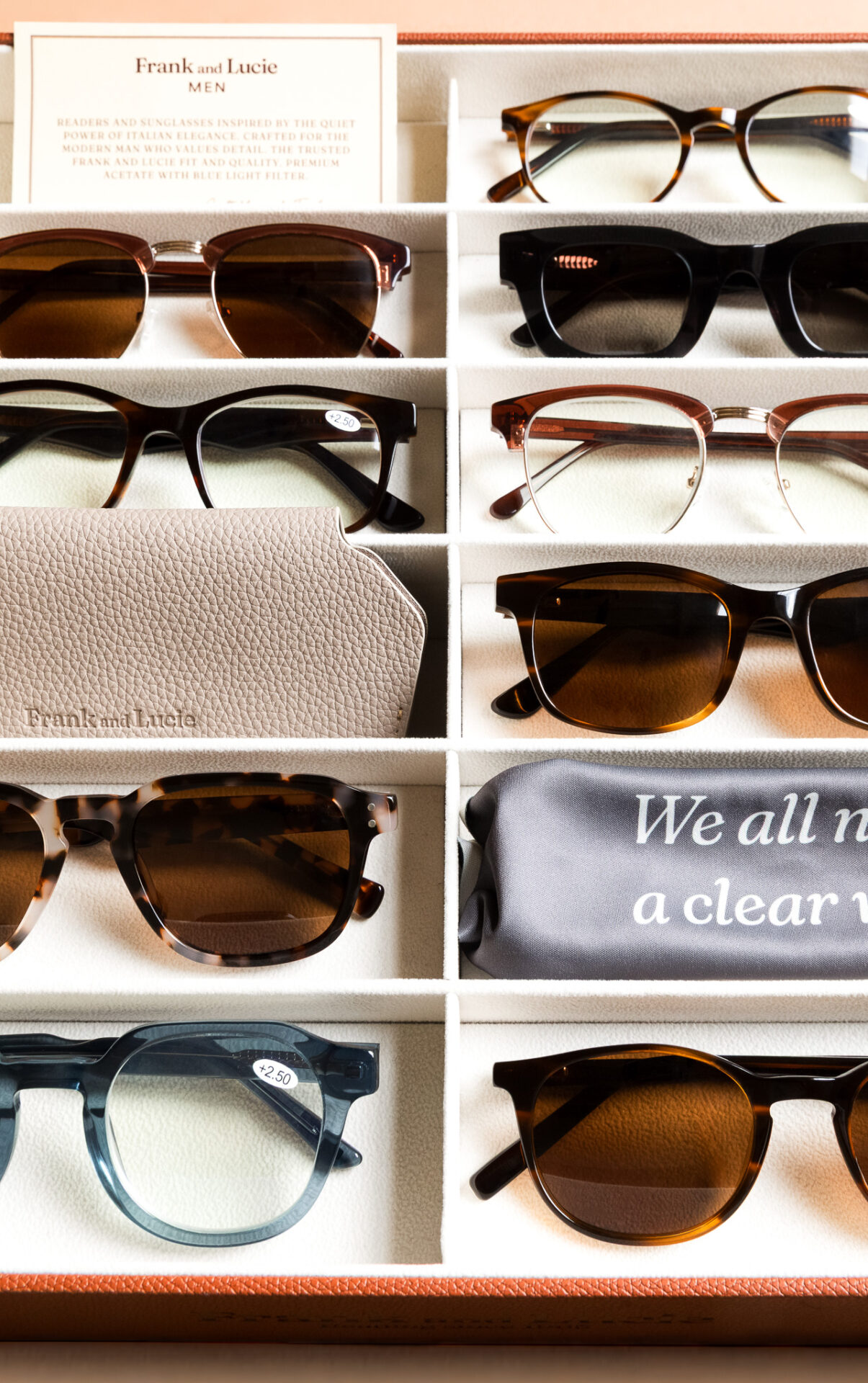 The Frank and Lucie Men’s Collection is a quiet tribute to the timeless elegance of Giorgio Armani. Bold yet understated frames crafted from premium acetate, with masculine silhouettes that feel both classic and modern. Models like Tributo, Aquila, Milano, Borgo and Giorgio come in rich, refined tones: the soft depth of Greyvanna, the subtle strength of Soft Ingreydient, the warmth of French Roast, and the creamy balance of Au Lait. Each pair includes a matching signature cleaning cloth and comes in a luxurious gift box.